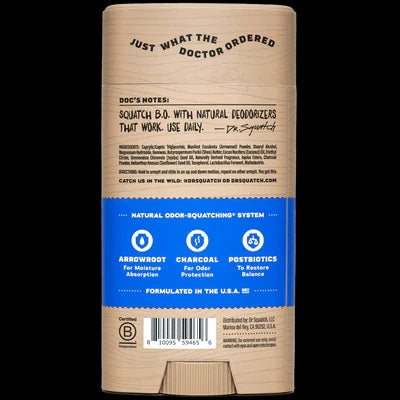 Dr. Squatch natural men’s deodorant keeps you fresh so that you can go about your day with confidence, no matter where it takes you. Our Odor-Squatching® system fights potential sources of B.O from every angle with powerful natural deodorizers such as charcoal powder to block odor, postbiotics help to prevent the growth of odor-causing bacteria, and arrowroot powder to absorb moisture. With a smooth glide application and skin-nourishing moisturizers like jojoba and shea butter, our deodorant is gentle on your skin and leaves you-and your pits-ready for any adventure.